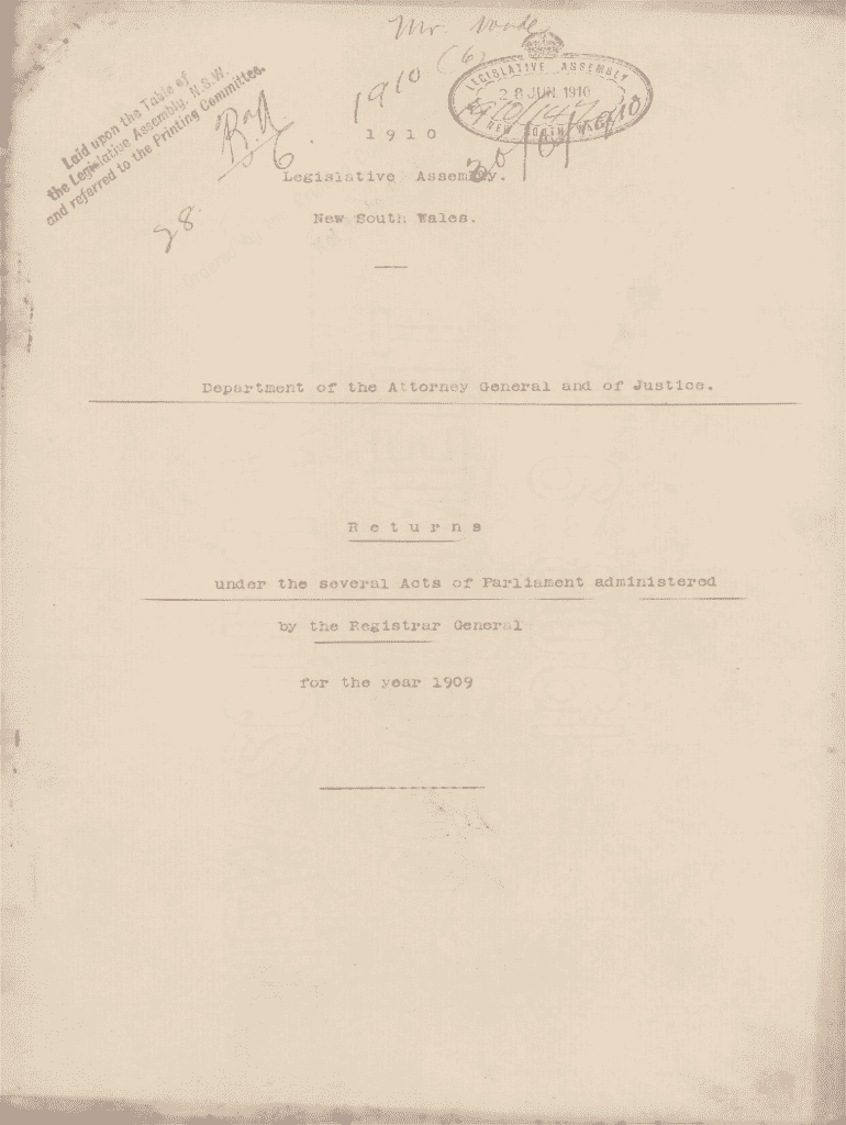 ft sB\'\' ErA 3^# V/ V\'r?Mft5\'1910LegislativeAssemNew South Tales.i !Department of the Attorney General and of Justice.Returnsunder the several Acts of Parliament administeredDy the Registrar Generalfor