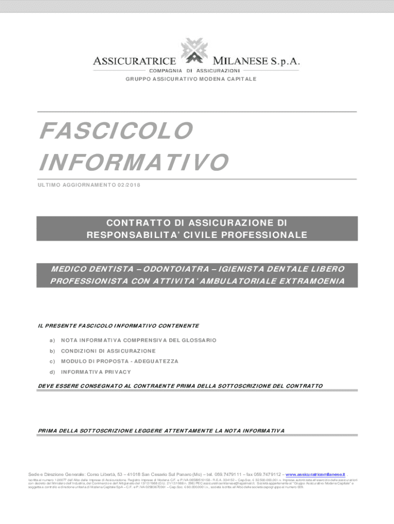 GRUPPO ASSICURATIVO MODENA CAPITALEFASCICOLO INFORMATIVO ULTIMO AGGIORNAMENTO 02/2018CONTRATTO DI ASSICURAZIONE DI RESPONSABILITA CIVILE PROFESSIONALEMEDICO DENTISTA ODONTOIATRA IGIENISTA DENTALE