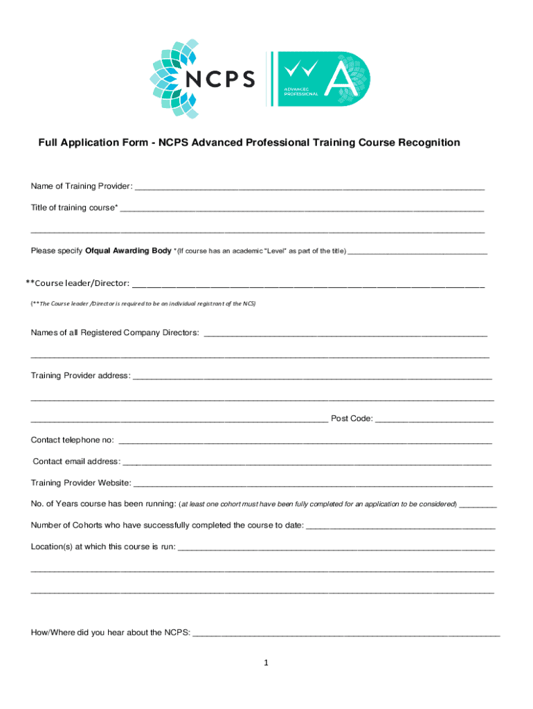 Full Application Form NCPS Advanced Professional Training Course RecognitionName of Training Provider: ___ Title of training course* ___ ___ Please specify Ofqual Awarding Body *(If course has an