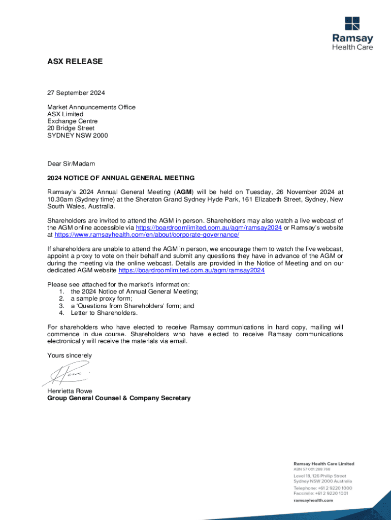 ASX RELEASE27 September 2024 Market Announcements Office ASX Limited Exchange Centre 20 Bridge Street SYDNEY NSW 2000Dear Sir/Madam 2024 NOTICE OF ANNUAL GENERAL MEETING Ramsays 2024 Annual General