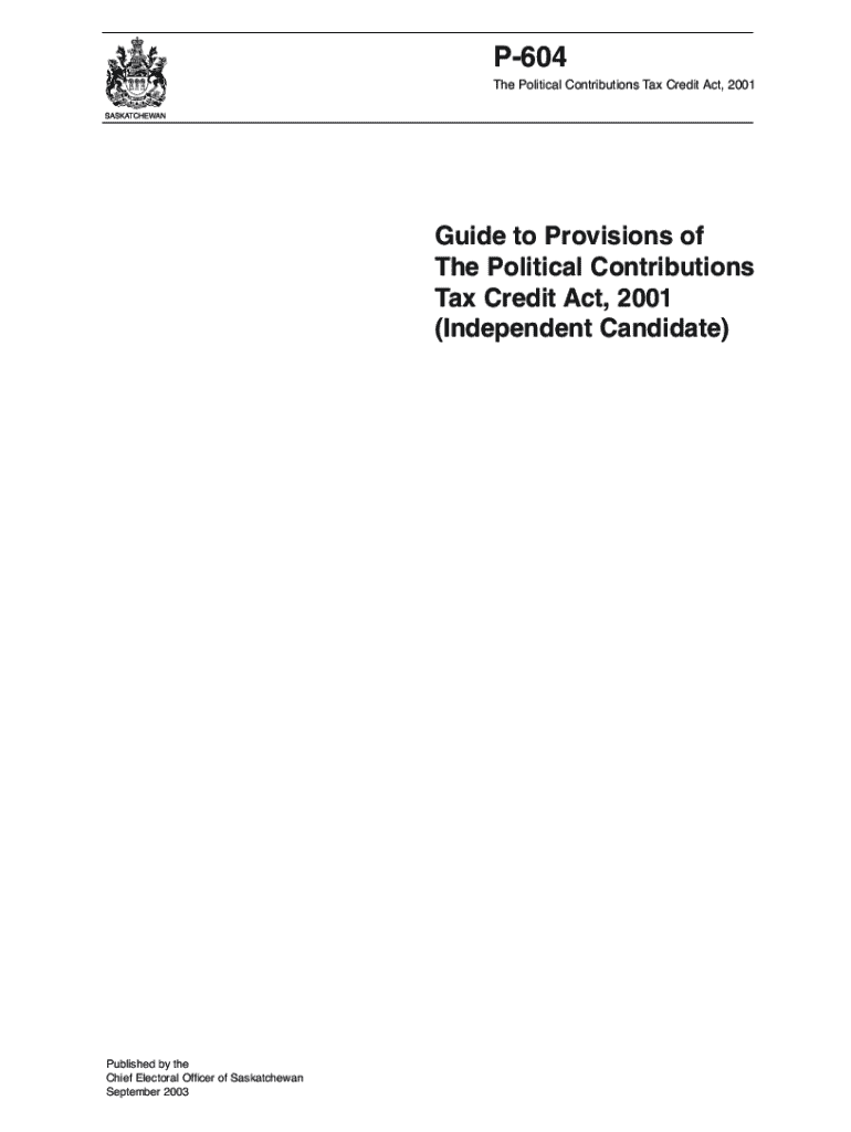 P604 The Political Contributions Tax Credit Act, 2001Guide to Provisions of The Political Contributions Tax Credit Act, 2001 (Independent Candidate)Published by the Chief Electoral Officer of Saskatchewan