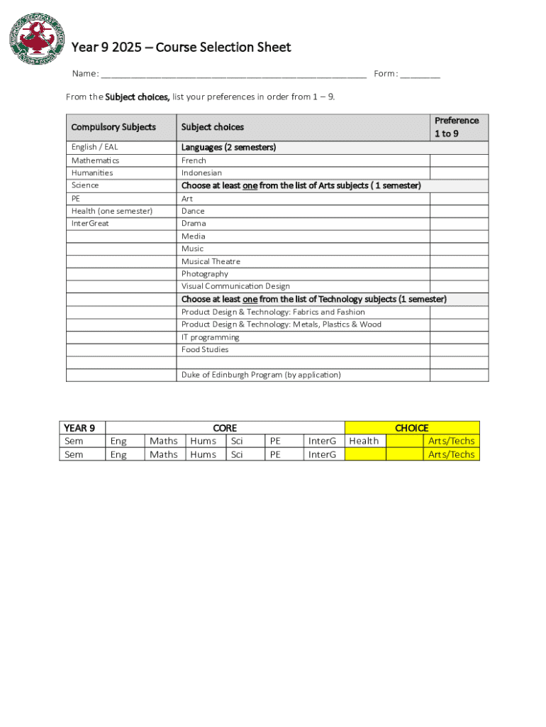 Get the free Year 9 Course Selection Sheet