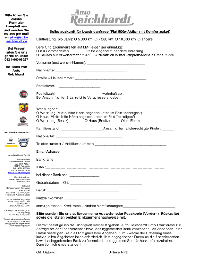 Bitte fllen Sie dieses Formular komplett aus und senden Sie es uns per mail an pkw@autoreichhardt.deSelbstauskunft fr Leasinganfrage (Fiat 500eAktion mit Komfortpaket) Laufleistung (pro Jahr): O 5.000