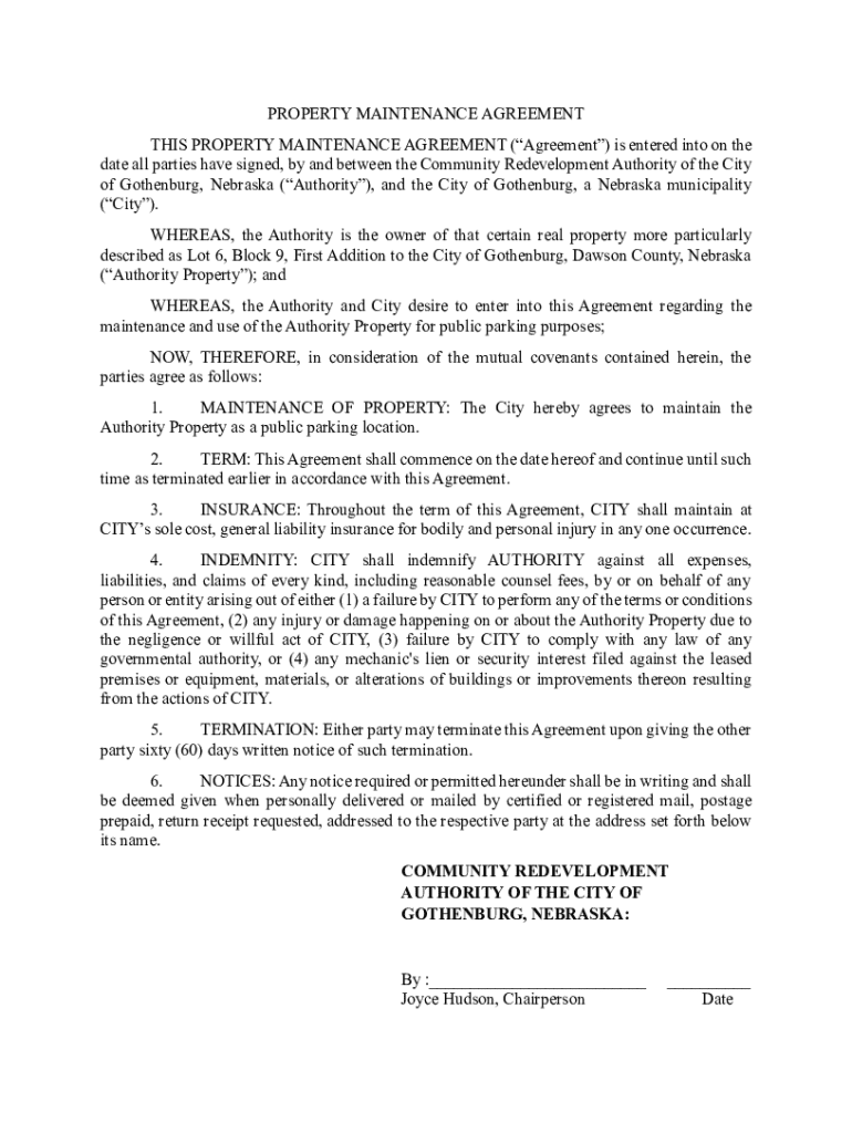 Get the free Property Maintenance Agreement City of Gothenburg - ci gothenburg ne