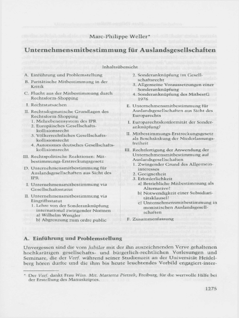 MarcPhilippe Weller*Unternehmensmitbestimmung fr Auslandsgesellschaften Inhaltsbersicht A. Einfhrung und Problemstellung B. Parittische M i t b e s t i m m u n g in der Kritik C. Flucht aus der M