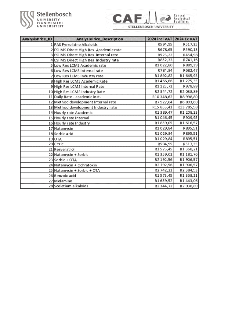 AnalysisPrice_ID 1 2 3 4 5 6 7 8 9 10 11 12 13 14 15 16 17 18 19 20 21 22 23 24 25 26 27 28AnalysisPrice_Description PAS Pyrrolizine Alkaloids ESI MS Direct High Res Academic rate ESI MS Direct High