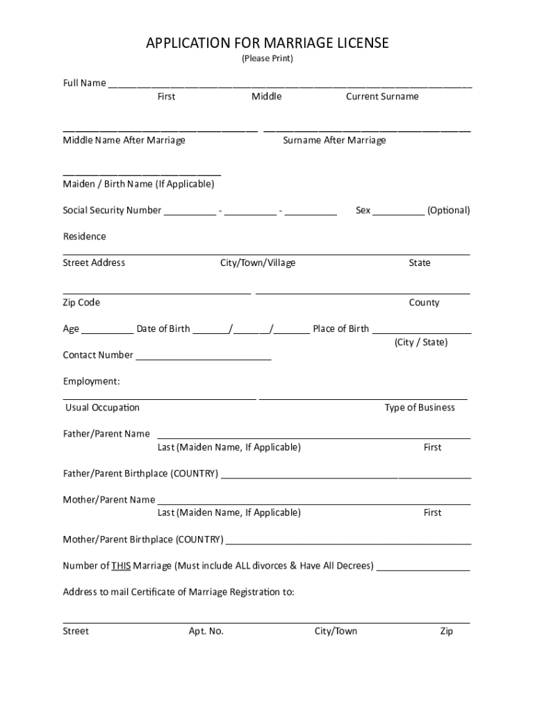 APPLICATION FOR MARRIAGE LICENSE (Please Print)Full Name ___ First Middle Current Surname___ ___ Middle Name After MarriageSurname After Marriage___ Maiden / Birth Name (If Applicable) Social Security