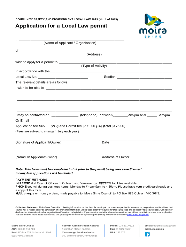 COMMUNITY SAFETY AND ENVIRONMENT LOCAL LAW 2013 (No .1 of 2013)Application for a Local Law permit I, ___ (Name of Applicant / Organisation) of ___ (Address) wish to apply for a permit to ___ (Type