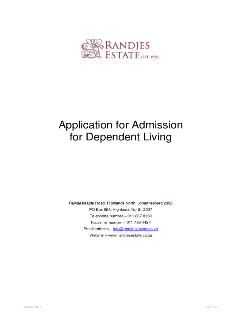 Application for Admission for Dependent LivingRandjeslaagte Road, Highlands North, Johannesburg 2092 PO Box 565, Highlands North, 2037 Telephone number 011 887 8160 Facsimile number 011 786 4424 Email