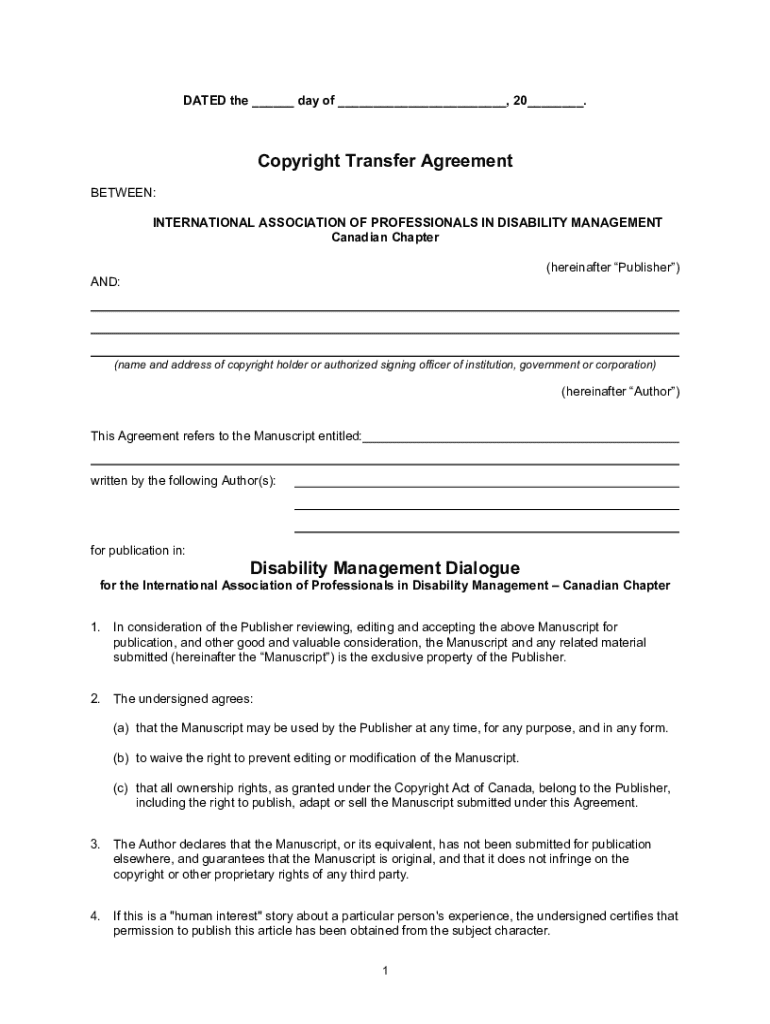 DATED the ___ day of ___, 20___.Copyright Transfer Agreement BETWEEN: INTERNATIONAL ASSOCIATION OF PROFESSIONALS IN DISABILITY MANAGEMENT Canadian Chapter (hereinafter Publisher) AND:(name and address
