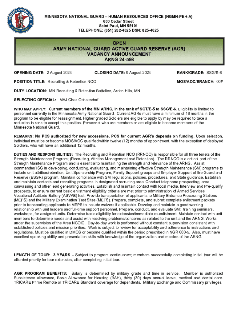 MINNESOTA NATIONAL GUARD HUMAN RESOURCES OFFICE (NGMNPEHA) 600 Cedar Street Saint Paul, MN 55101 TELEPHONE: (651) 2824625 DSN: 8254625OPEN ARMY NATIONAL GUARD ACTIVE GUARD RESERVE (AGR) VACANCY ANNOUNCEMENT