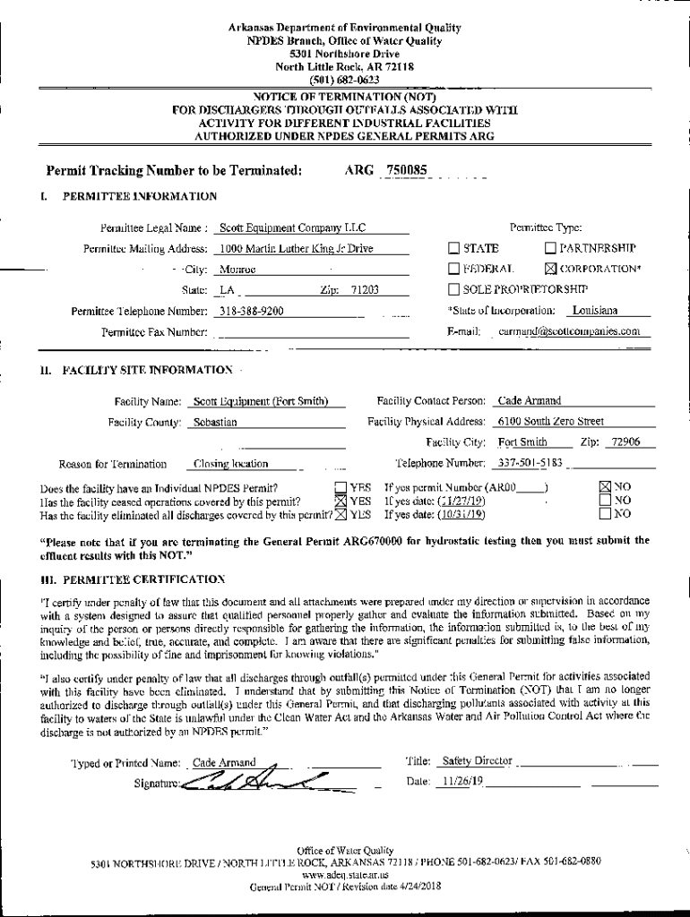 ARG750085 Notice of Termination Invoicing Khan, Faizan Fri 12/6/2019 8:24 AM To: Purvis, James PURVISJ@adeq.state.ar.us;1 attachmentARG750085_Invoice Summary_20191206.pdf;Hi Jim, We have recently