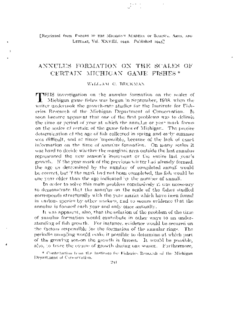 [Reprinted fromPAPERS OF THE ::IICHIGAN .CADDfY OF SCIENCE. ARTS, A.\'l\"D LETTERS,Vol. XXVIII,1942.Published1943]AXXl:Ll\'\"S FOR:IATIOX OX THE SCALES OF CERTAIX :IICHIGAX GA:IE FISHES* YILLLLI C.