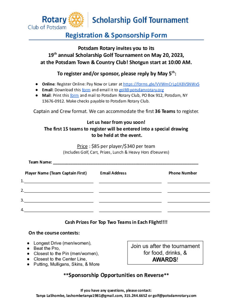 Registration & Sponsorship Form Potsdam Rotary invites you to its 19 annual Scholarship Golf Tournament on May 20, 2023, at the Potsdam Town & Country Club! Shotgun start at 10:00 AM. thTo register