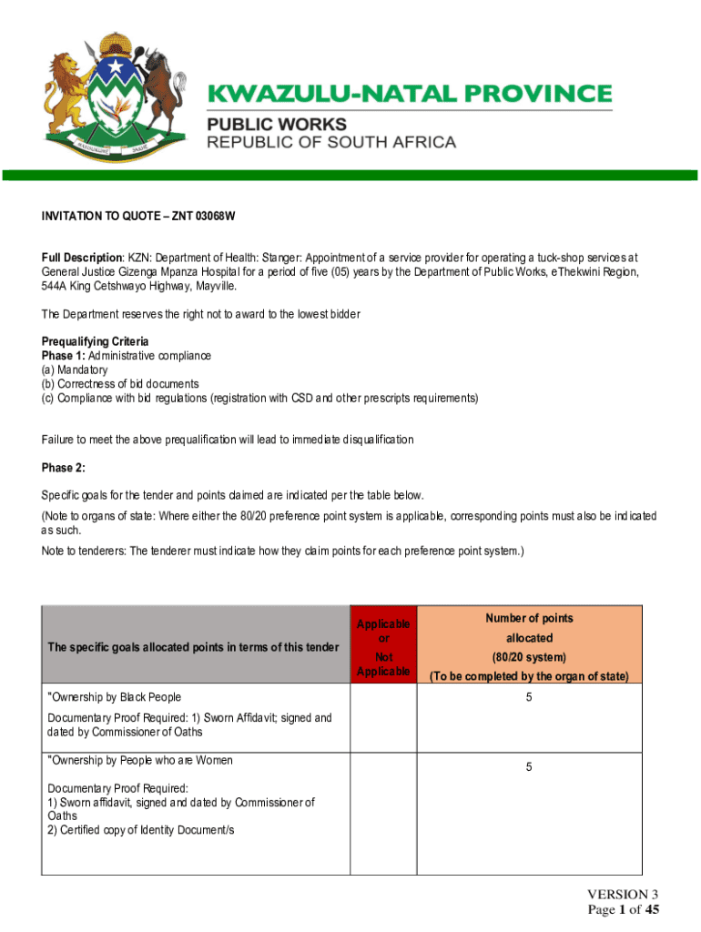 This document invites bids for the appointment of a service provider to operate tuck-shop services at General Justice Gizenga Mpanza Hospital for a period of five years. The tender includes prequalification criteria, specific goals for tender points, and details regarding the bidding process.