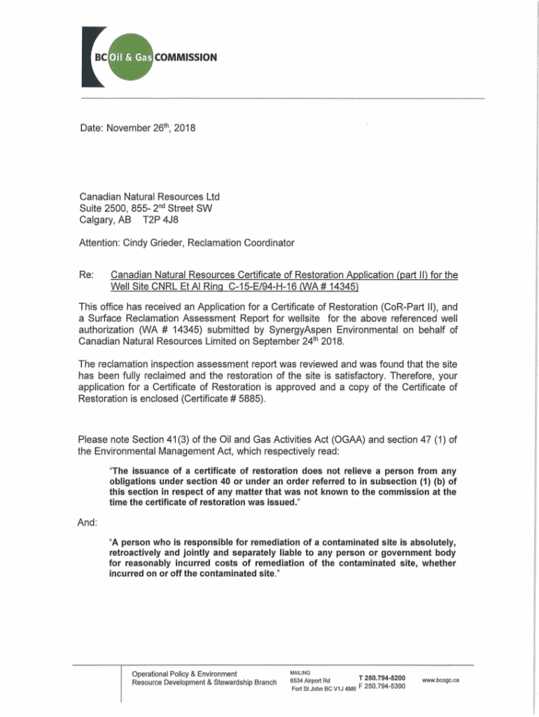 Date: November 26th, 2018Canadian Natural Resources Ltd Suite 2500, 855 2nd Street SW Calgary, AB T2P 4J8 Attention: Cindy Grieder, Reclamation Coordinator Re:Canadian Natural Resources Certificate