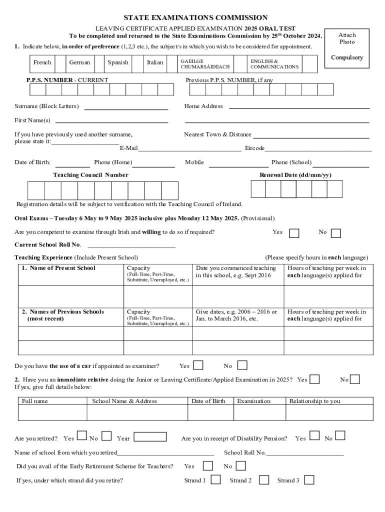 STATE EXAMINATIONS COMMISSION LEAVING CERTIFICATE APPLIED EXAMINATION 2025 ORAL TEST To be completed and returned to the State Examinations Commission by 25th October 2024.Attach Photo1. Indicate