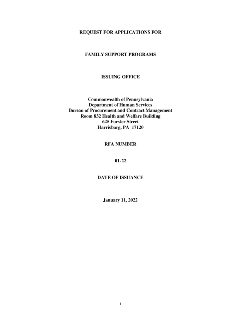 REQUEST FOR APPLICATIONS FORFAMILY SUPPORT PROGRAMSISSUING OFFICECommonwealth of Pennsylvania Department of Human Services Bureau of Procurement and Contract Management Room 832 Health and Welfare