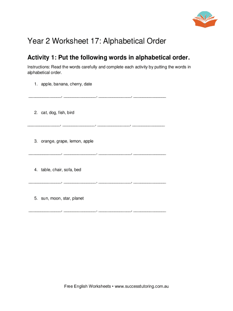 Year 2 Worksheet 17: Alphabetical Order Activity 1: Put the following words in alphabetical order. Instructions: Read the words carefully and complete each activity by putting the words in alphabetical