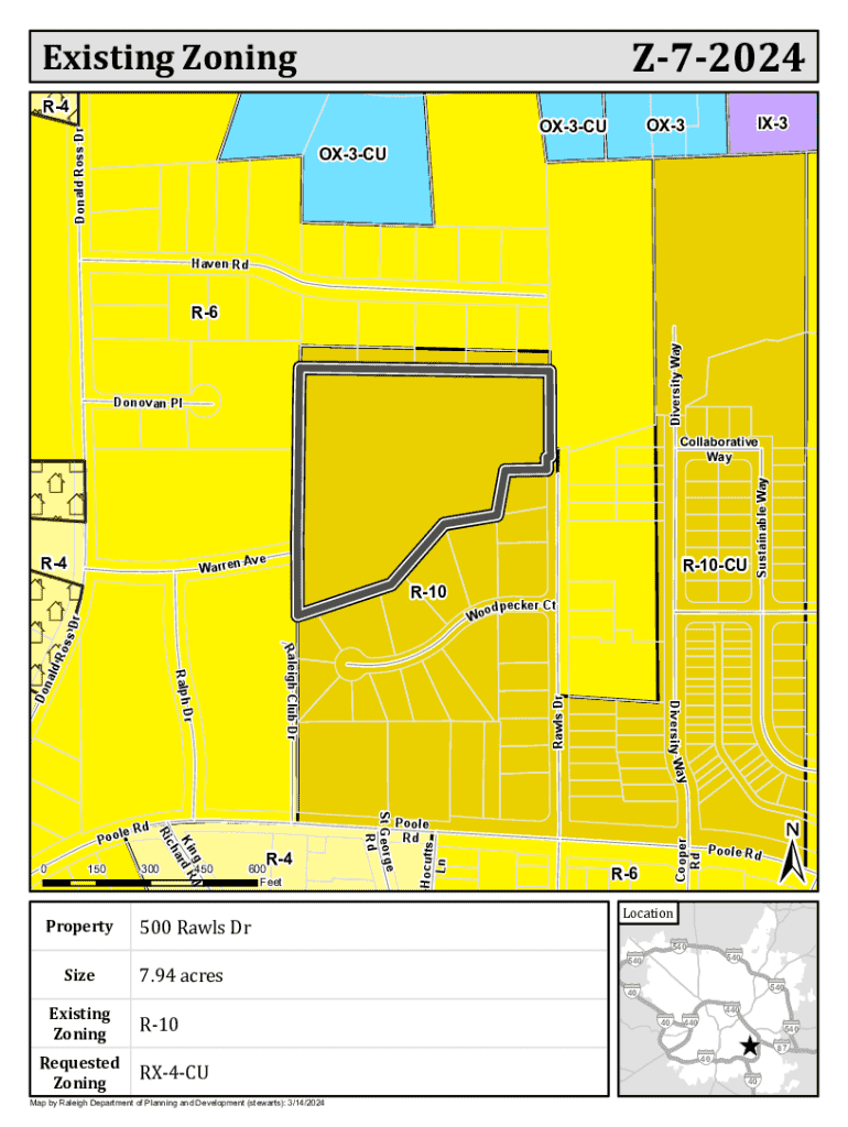 Z72024Existing Zoning R4 Donald Ross DrIX3OX3OX3CU OX3CUHaven RdDiversity WayR6Donovan PlAve WarrenR10CUSize450Rawls DrSt Ge orge RdProperty300ng d Ki rd R a ch150R4600 Feet500 Rawls Dr7.94 acresHocutts