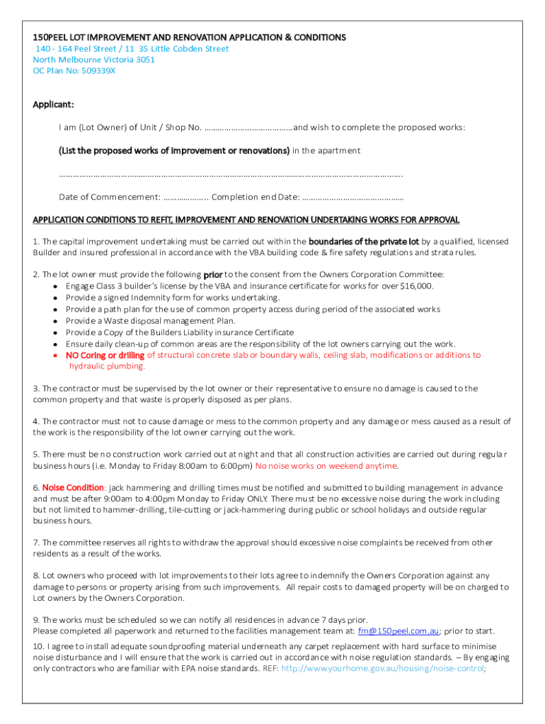 150PEEL LOT IMPROVEMENT AND RENOVATION APPLICATION & CONDITIONS 140 164 Peel Street / 11 35 Little Cobden Street North Melbourne Victoria 3051 OC Plan No: 509339XApplicant: I am (Lot Owner) of Unit