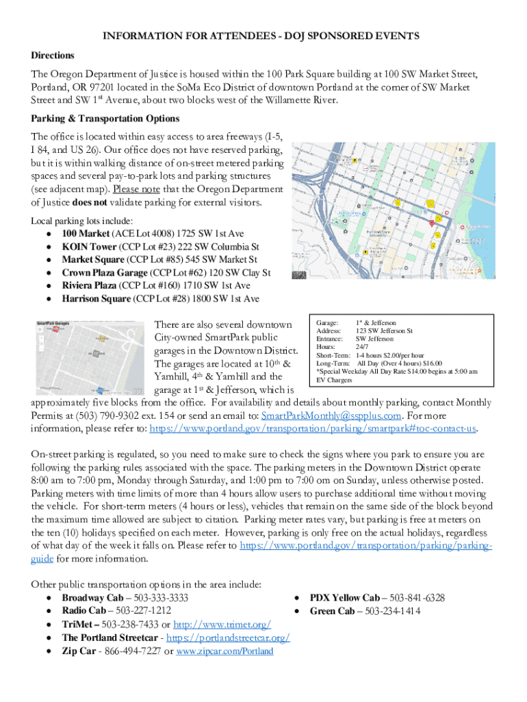 INFORMATION FOR ATTENDEES DOJ SPONSORED EVENTS DirectionsThe Oregon Department of Justice is housed within the 100 Park Square building at 100 SW Market Street, Portland, OR 97201 located in the Eco