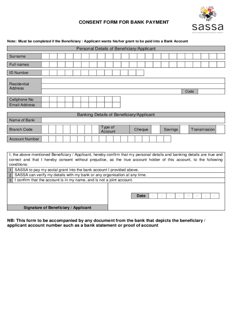 CONSENT FORM FOR BANK PAYMENTNote: Must be completed if the Beneficiary / Applicant wants his/her grant to be paid into a Bank AccountPersonal Details of Beneficiary/Applicant Surname.Full names.ID