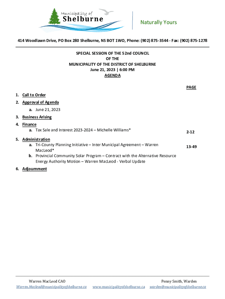 Naturally Yours 414 Woodlawn Drive, PO Box 280 Shelburne, NS BOT 1WO, Phone: (902) 8753544 Fax: (902) 8751278 SPECIAL SESSION OF THE 52nd COUNCIL OF THE MUNICIPALITY OF THE DISTRICT OF SHELBURNE June