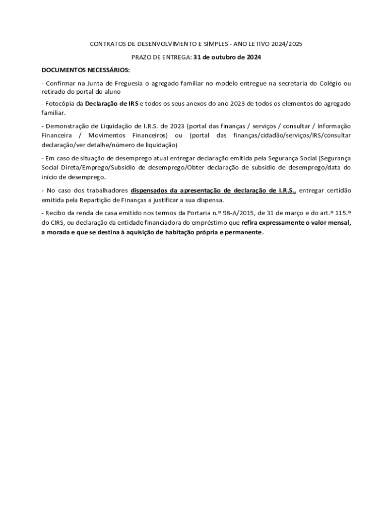 CONTRATOS DE DESENVOLVIMENTO E SIMPLES ANO LETIVO 2024/2025 PRAZO DE ENTREGA: 31 de outubro de 2024 DOCUMENTOS NECESSRIOS: Confirmar na Junta de Freguesia o agregado familiar no modelo entregue na