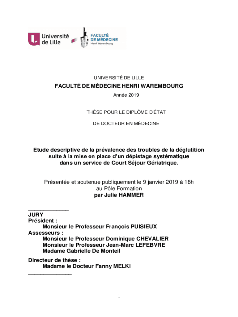 UNIVERSIT DE LILLEFACULT DE MDECINE HENRI WAREMBOURG Anne 2019THSE POUR LE DIPLME D\'TAT DE DOCTEUR EN MDECINEEtude descriptive de la prvalence des troubles de la dglutition suite la mise en place
