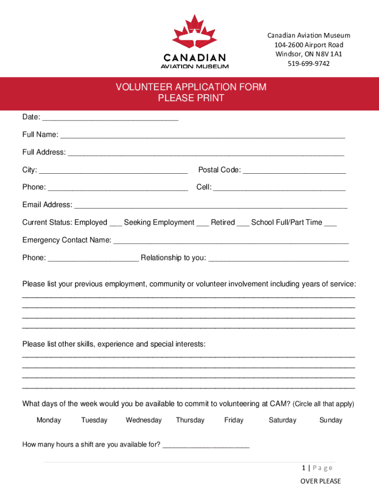 Canadian Aviation Museum 1042600 Airport Road Windsor, ON N8V 1A1 5196999742VOLUNTEER APPLICATION FORM PLEASE PRINT Date: ___ Full Name: ___ Full Address: ___ City: ___Postal Code: ___Phone: ___Cell: