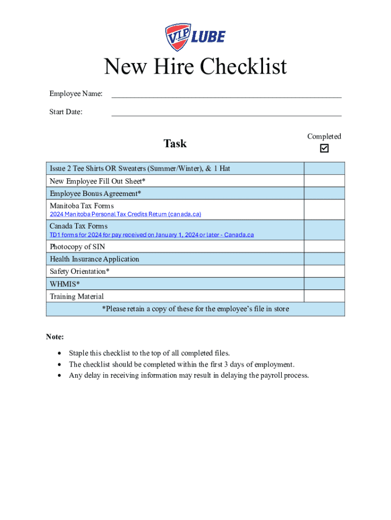 New Hire Checklist Employee Name:___Start Date:___TaskCompletedIssue 2 Tee Shirts OR Sweaters (Summer/Winter), & 1 Hat New Employee Fill Out Sheet* Employee Bonus Agreement* Manitoba Tax Forms2024