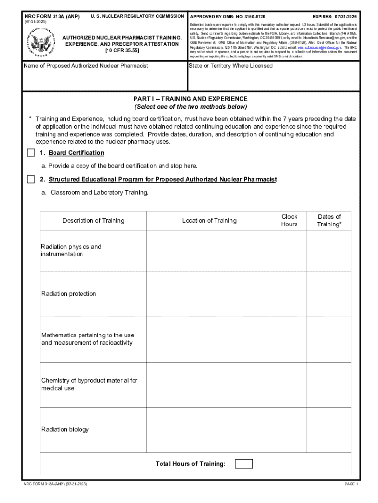 Get the free NRC Form 313A (ANP), Authorized Nuclear Pharmacist Training, Experience, and Precept...