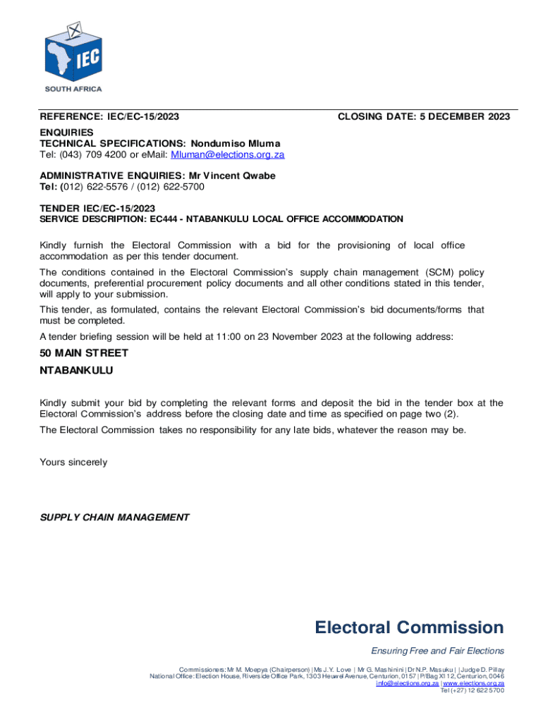 REFERENCE: IEC/EC15/2023CLOSING DATE: 5 DECEMBER 2023ENQUIRIES TECHNICAL SPECIFICATIONS: Nondumiso Mluma Tel: (043) 709 4200 or eMail: Mluman@elections.org.za ADMINISTRATIVE ENQUIRIES: Mr Vincent