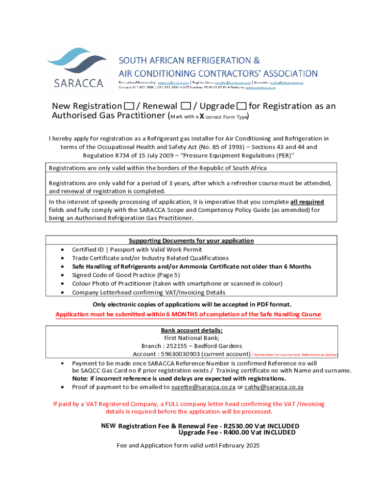 This document is an application form for individuals seeking registration as an Authorised Gas Practitioner in the field of Refrigeration gas installation for Air Conditioning and Refrigeration. It outlines the necessary qualifications, supporting documents, fees, and compliance requirements along with the conditions of registration within the Republic of South Africa.