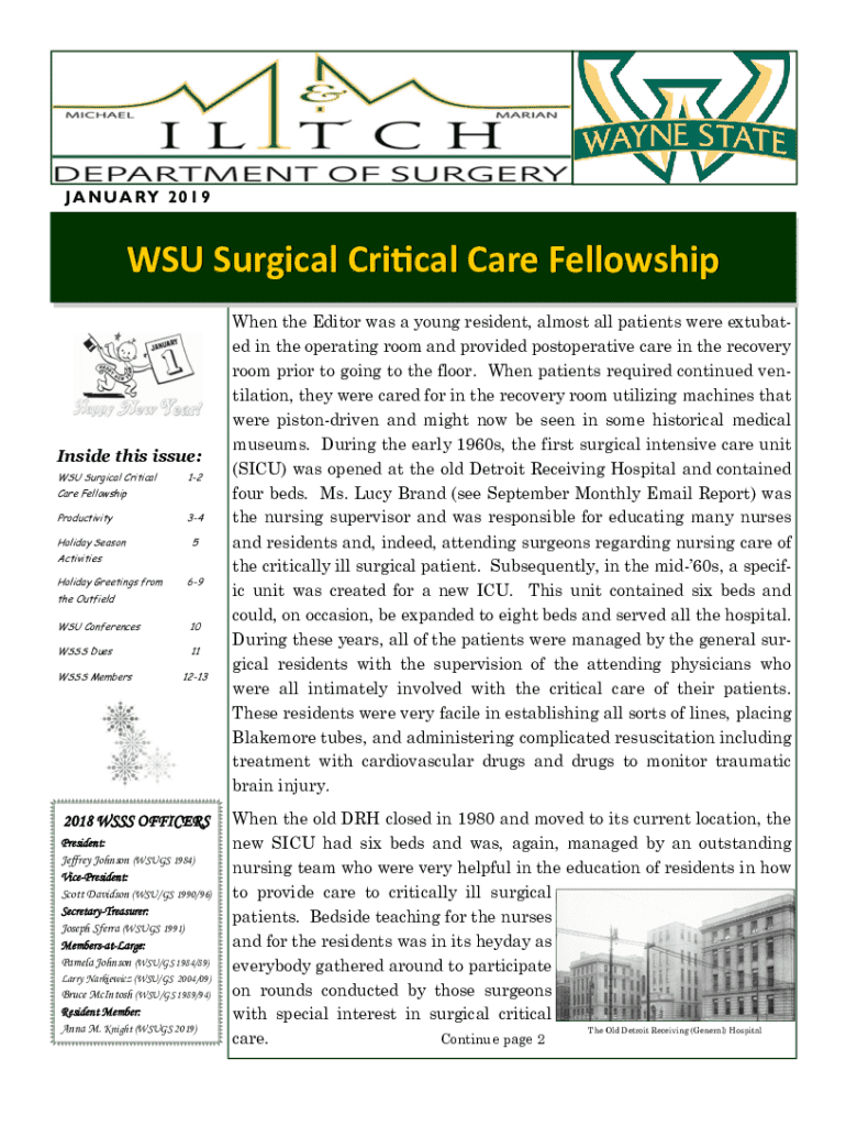 This newsletter discusses the WSU Surgical Critical Care Fellowship, including its history, productivity reports from faculty members, holiday activities, and announcements regarding the Wayne State Surgical Society. It highlights important research publications, the fellowship\'s current leadership, and events aimed at fostering community among faculty, residents, and alumni.