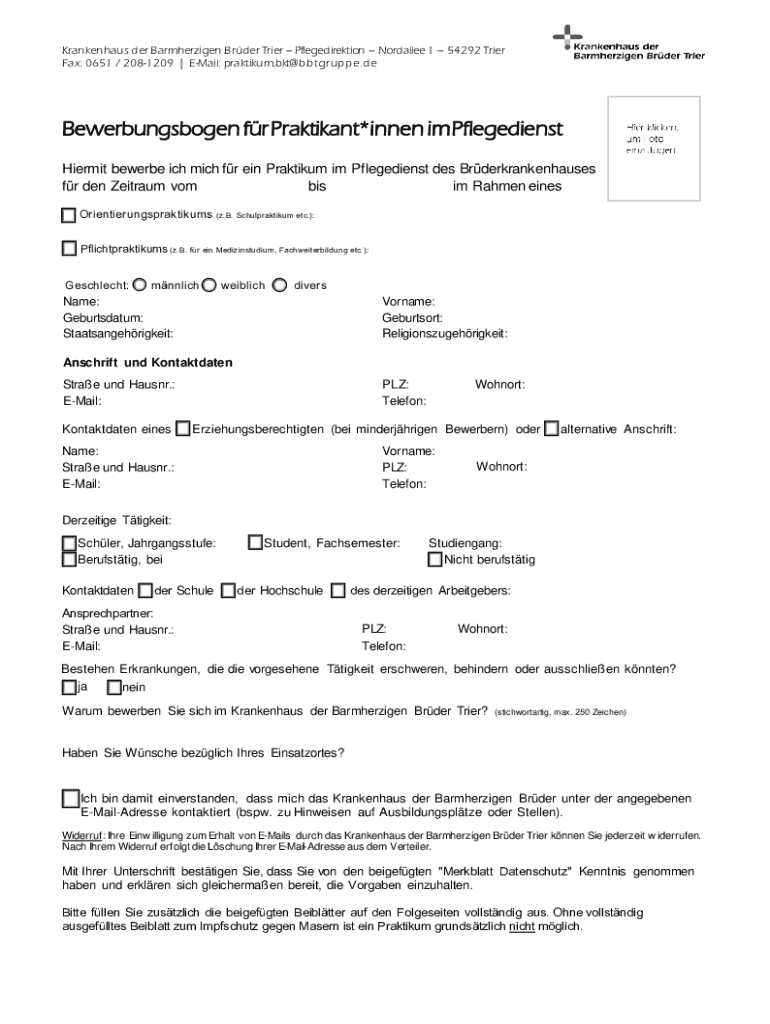 Krankenhaus der Barmherzigen Brder Trier Pflegedirektion Nordallee 1 54292 Trier Fax: 0651 / 2081209 | EMail: praktikum.bkt@bbtgruppe.deBitte Lichtbild oder Foto einfgenBewerbungsbogen fr Praktikant*innen