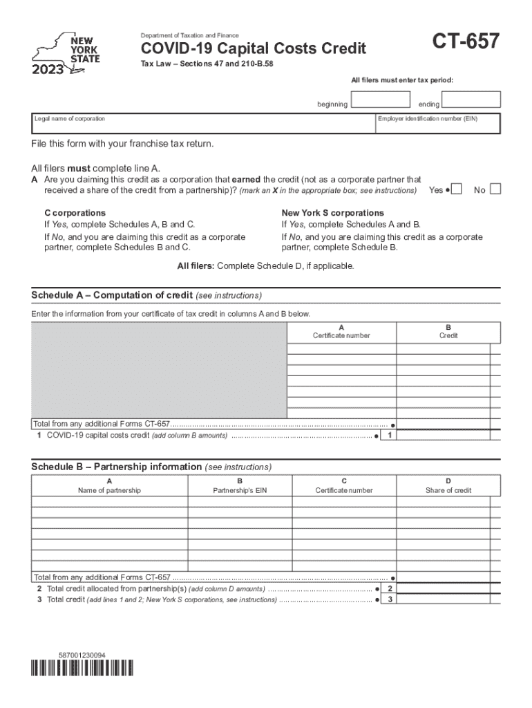 CT657Department of Taxation and FinanceCOVID19 Capital Costs Credit Tax Law Sections 47 and 210B.58All filers must enter tax period: beginning Legal name of corporationending Employer identification
