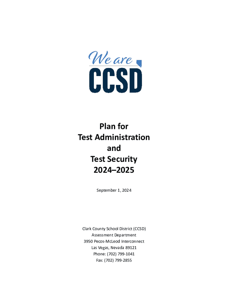 This document outlines the procedures and protocols for test administration and security for the 2024-2025 school year within the Clark County School District. It includes requirements for principals, test administrators, and coordinators, along with detailed responsibilities, security measures, testing schedules, and procedures for reporting and investigating testing irregularities.