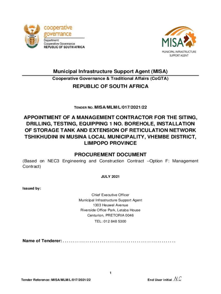 This document outlines the tender requirements for the appointment of a management contractor to site, drill, test, equip a borehole, install a storage tank, and extend the reticulation network in Tshikhudini, Musina Local Municipality. It includes procedures for tendering, evaluation, and conditions as per NEC3 guidelines.