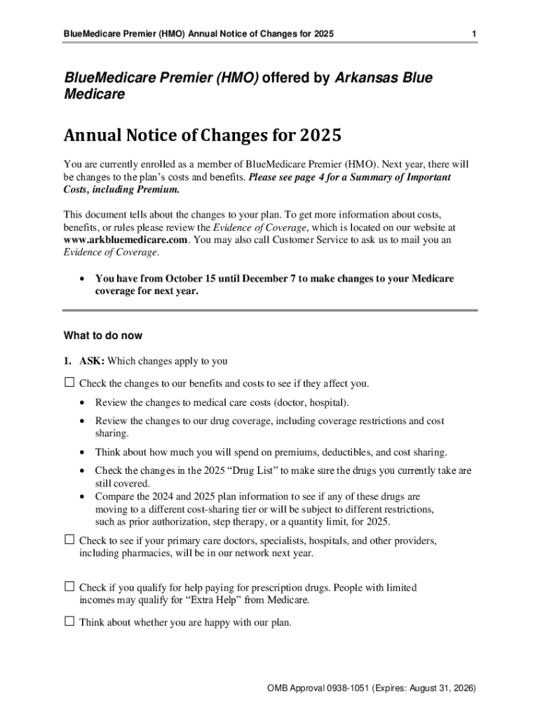 BlueMedicare Premier (HMO) Annual Notice of Changes for 20251BlueMedicare Premier (HMO) offered by Arkansas Blue MedicareAnnual Notice of Changes for 2025 You are currently enrolled as a member of