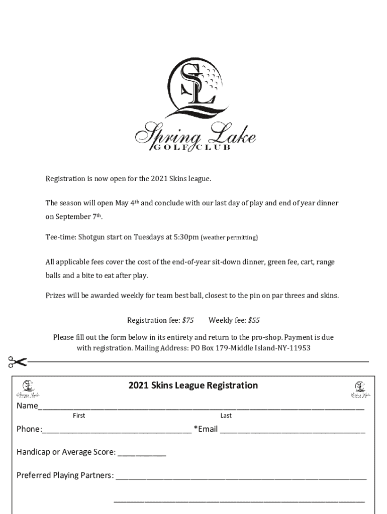 This document is a registration form for the 2021 Skins league, providing information on the league\'s schedule, fees, and details required for sign-up.