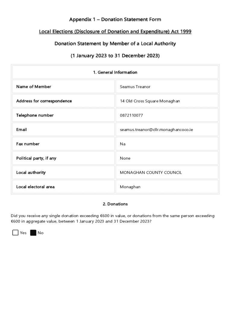 Appendix 1 Donation Statement Form Local Elections (Disclosure of Donation and Expenditure) Act 1999 Donation Statement by Member of a Local Authority (1 January 2023 to 31 December 2023) 1. General