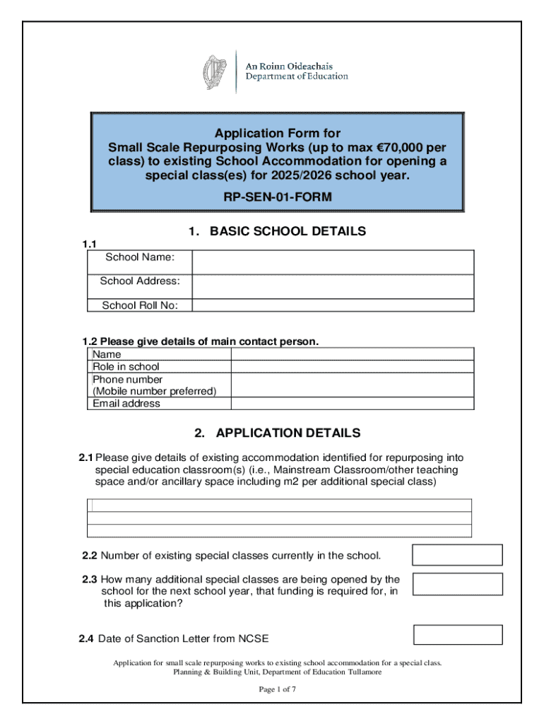 This application form is designed for schools seeking funding for small scale repurposing works to existing accommodation in order to open special classes for the 2025/2026 school year. The application outlines the basic details required from the school, information on existing accommodations, proposed repurposing works, and the necessary declarations and certifications.