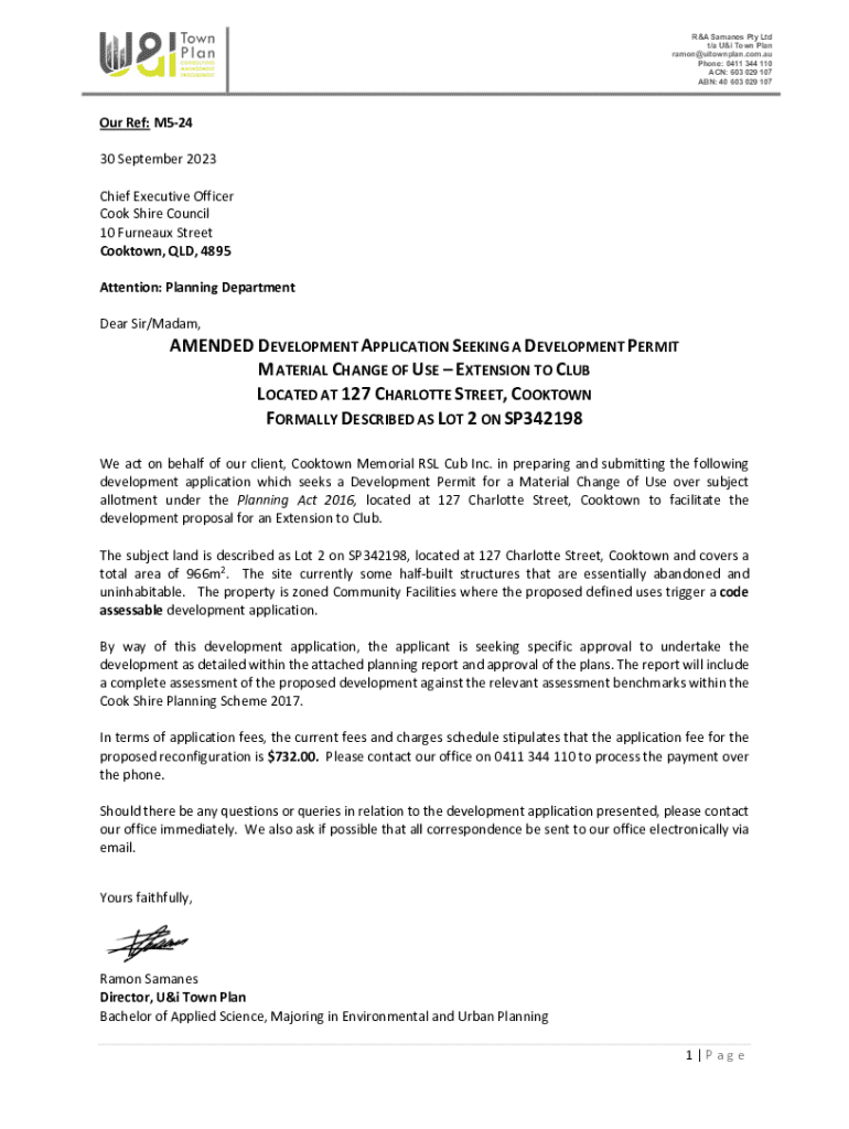 This document outlines an amended development application submitted by Cooktown Memorial RSL Club Inc. for a development permit for a material change of use to facilitate an extension to their club located at 127 Charlotte Street, Cooktown. The proposal includes renovations to provide more space for patrons and increase the size of the gaming area while ensuring compliance with relevant local and state planning regulations.