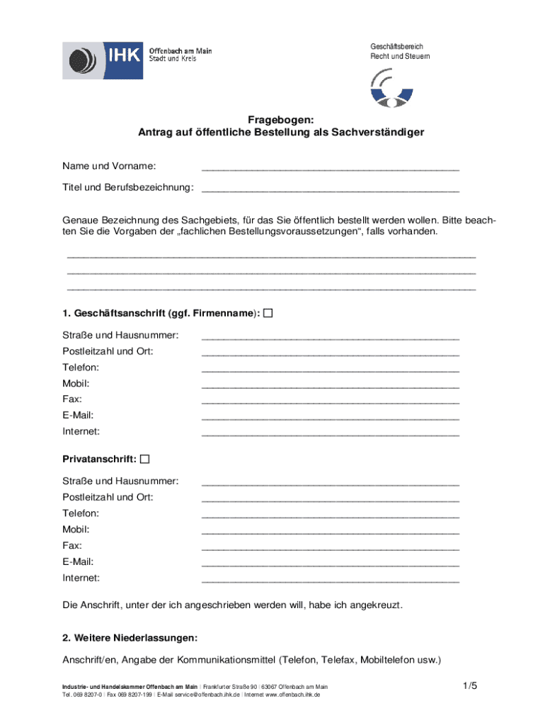 Geschftsbereich Recht und SteuernFragebogen: Antrag auf ffentliche Bestellung als Sachverstndiger Name und Vorname:___Titel und Berufsbezeichnung: ___Genaue Bezeichnung des Sachgebiets, fr das Sie