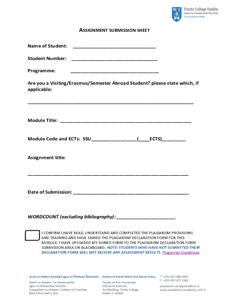 ASSIGNMENT SUBMISSION SHEET Name of Student:___Student Number: ___ Programme:___Are you a Visiting/Erasmus/Semester Abroad Student? please state which, if applicable: ___Module Title: ___Module Code