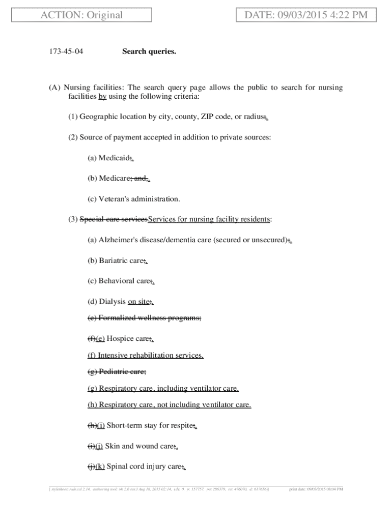 ACTION: Original1734504DATE: 09/03/2015 4:22 PMSearch queries.(A) Nursing facilities: The search query page allows the public to search for nursing facilities by using the following criteria: (1)