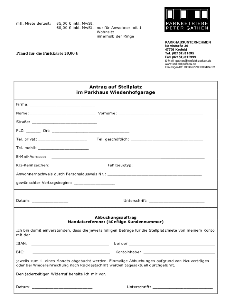 mtl. Miete derzeit:85,00 inkl. MwSt. 60,00 inkl. MwSt. nur fr Anwohner mit 1. Wohnsitz innerhalb der Ringe PARKHAUSUNTERNEHMEN Nordstrae 30 47798 Krefeld Tel. (02151) 81695 Fax (02151) 816999Pfand