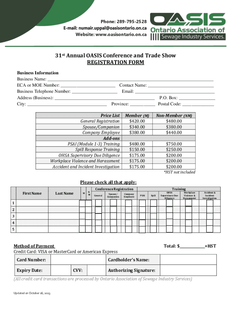 This document serves as the registration form for the 31st Annual OASIS Conference and Trade Show, detailing various registration options, pricing, and training add-ons for participants and their associates.